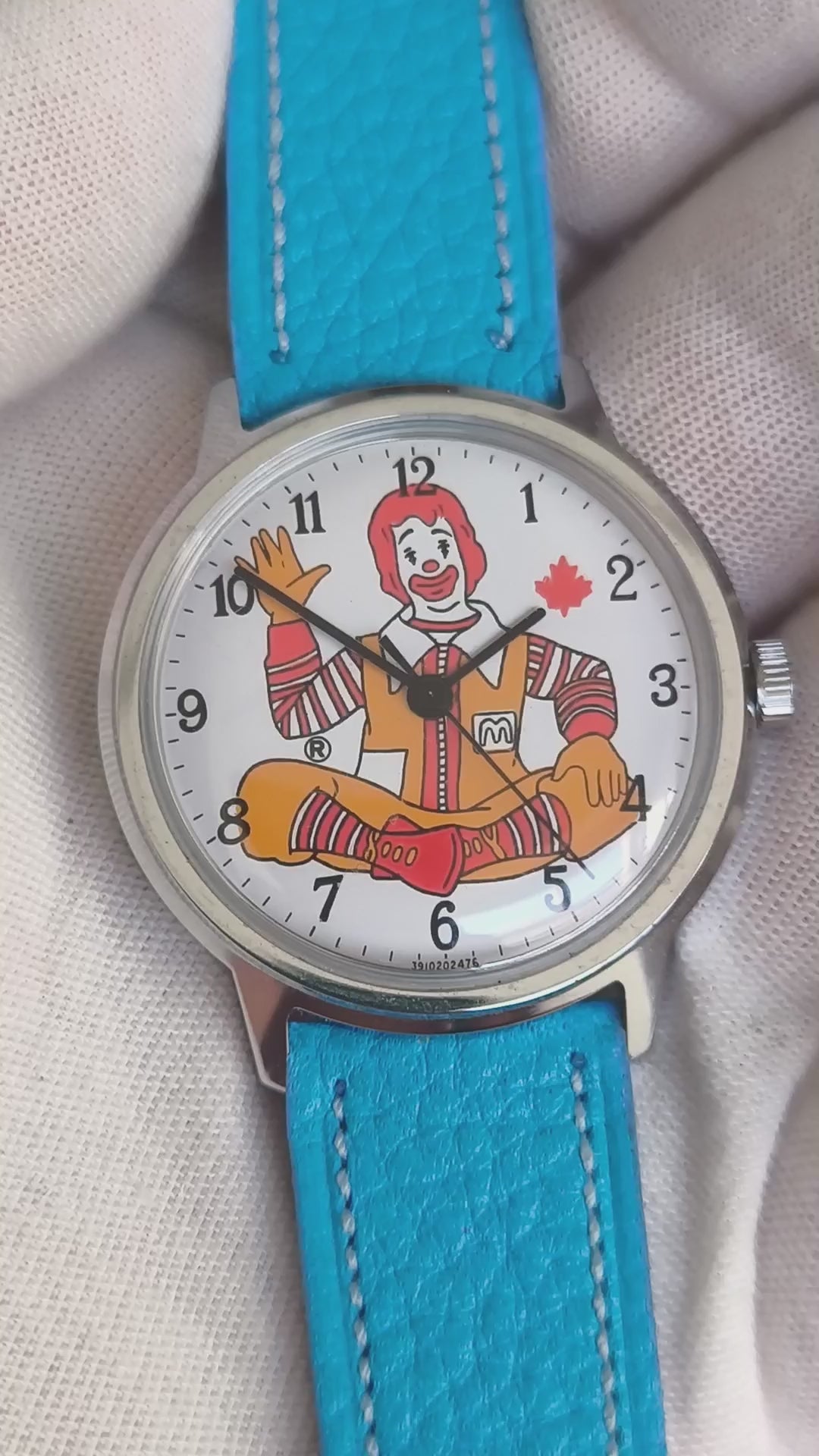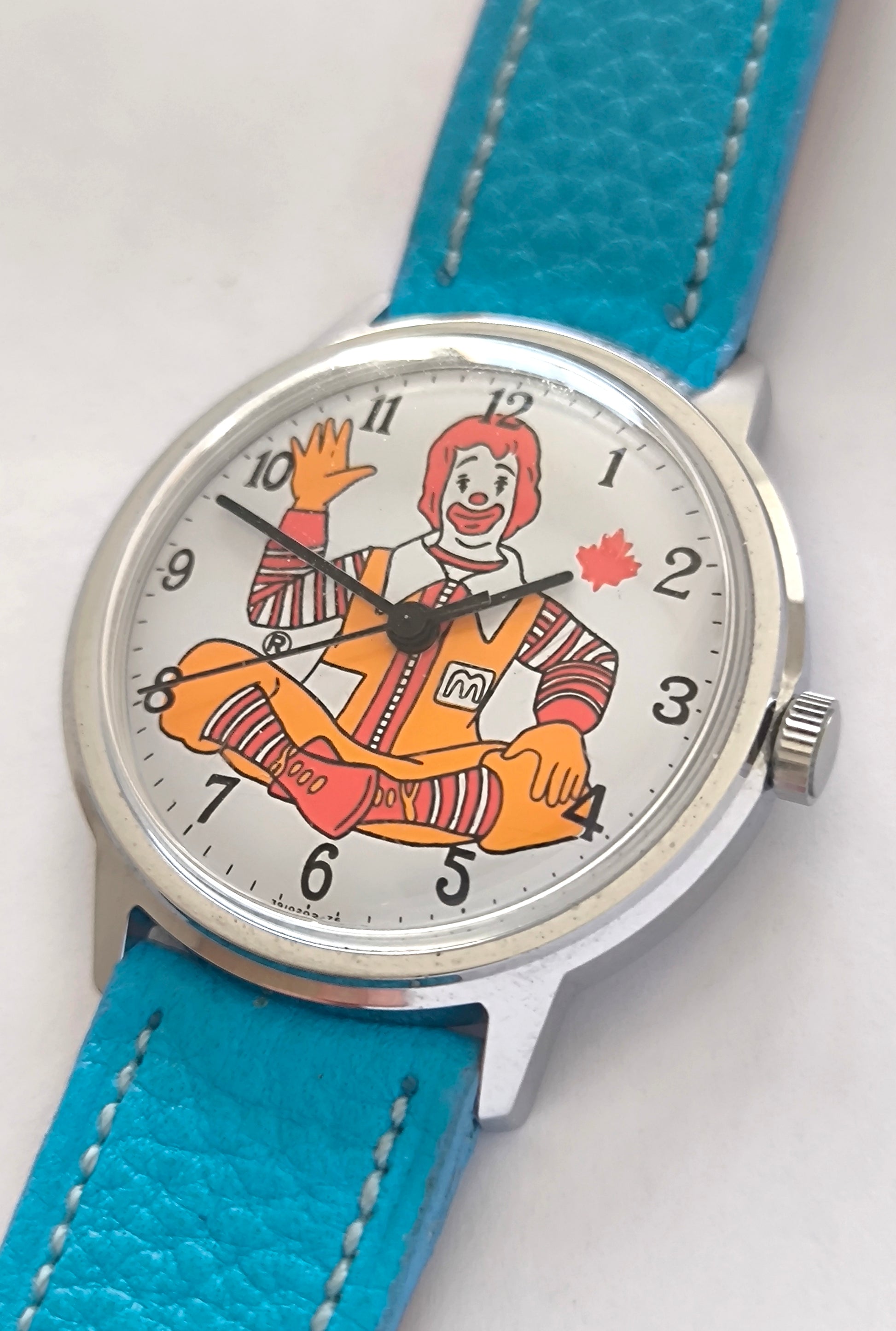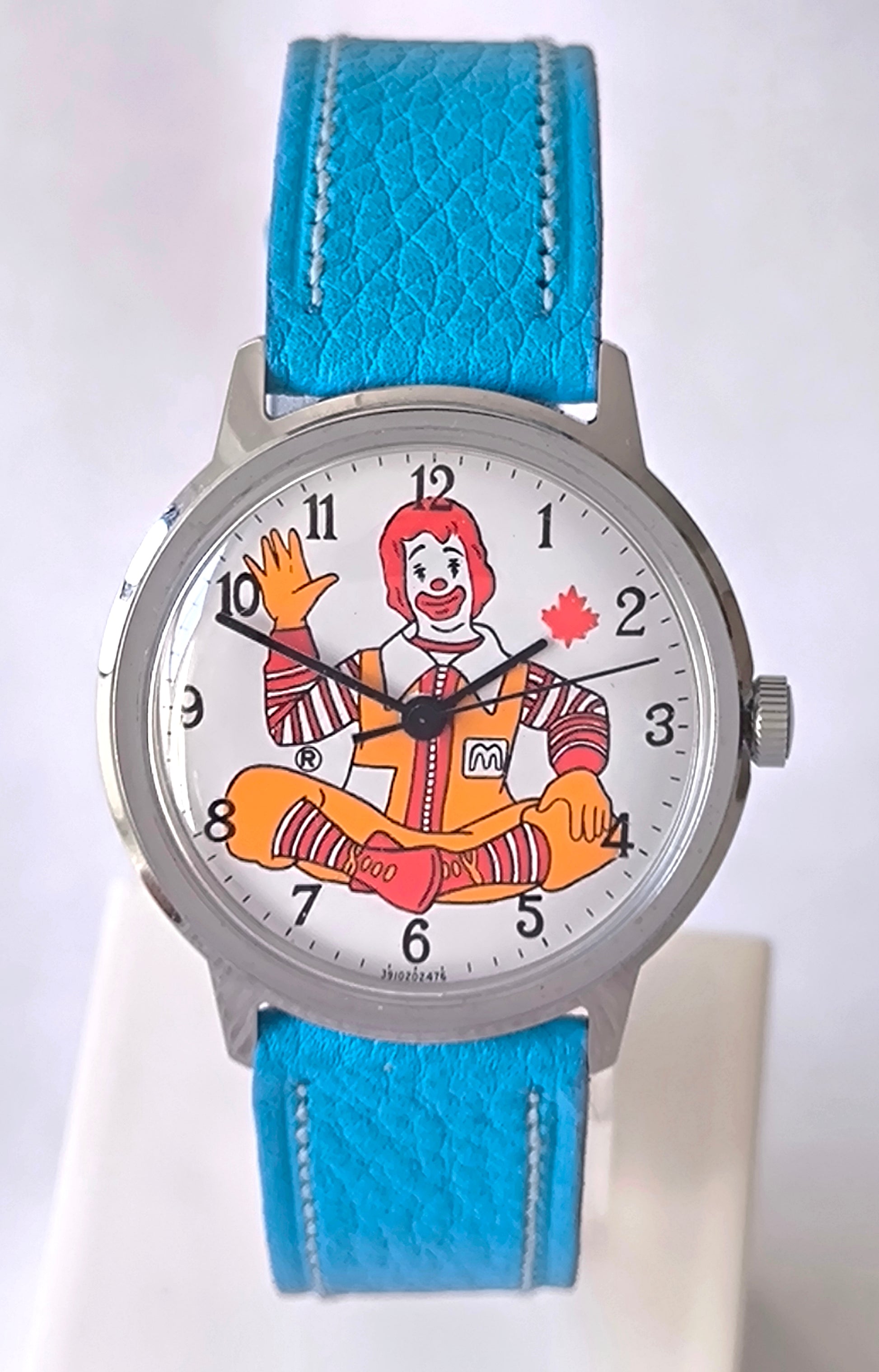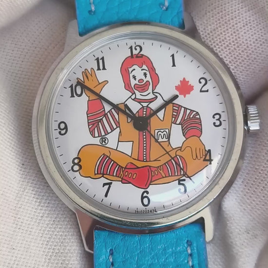 •Special Features: Dial displays a picture of the character Ronald McDonald, the mascot for the fast food company McDonalds, accompanied by a maple leaf suggesting this vintage Timex watch was made for the Canadian market.