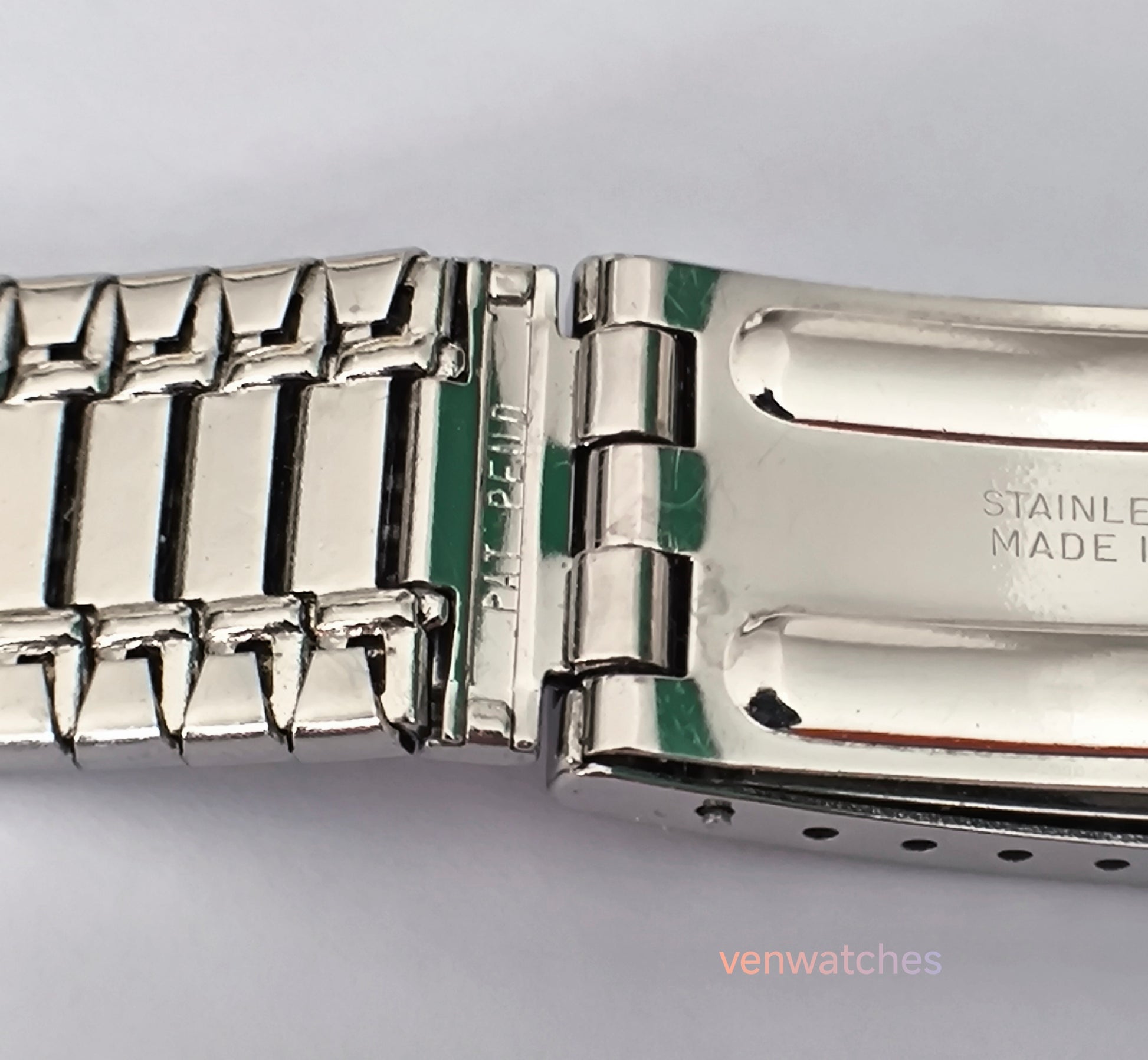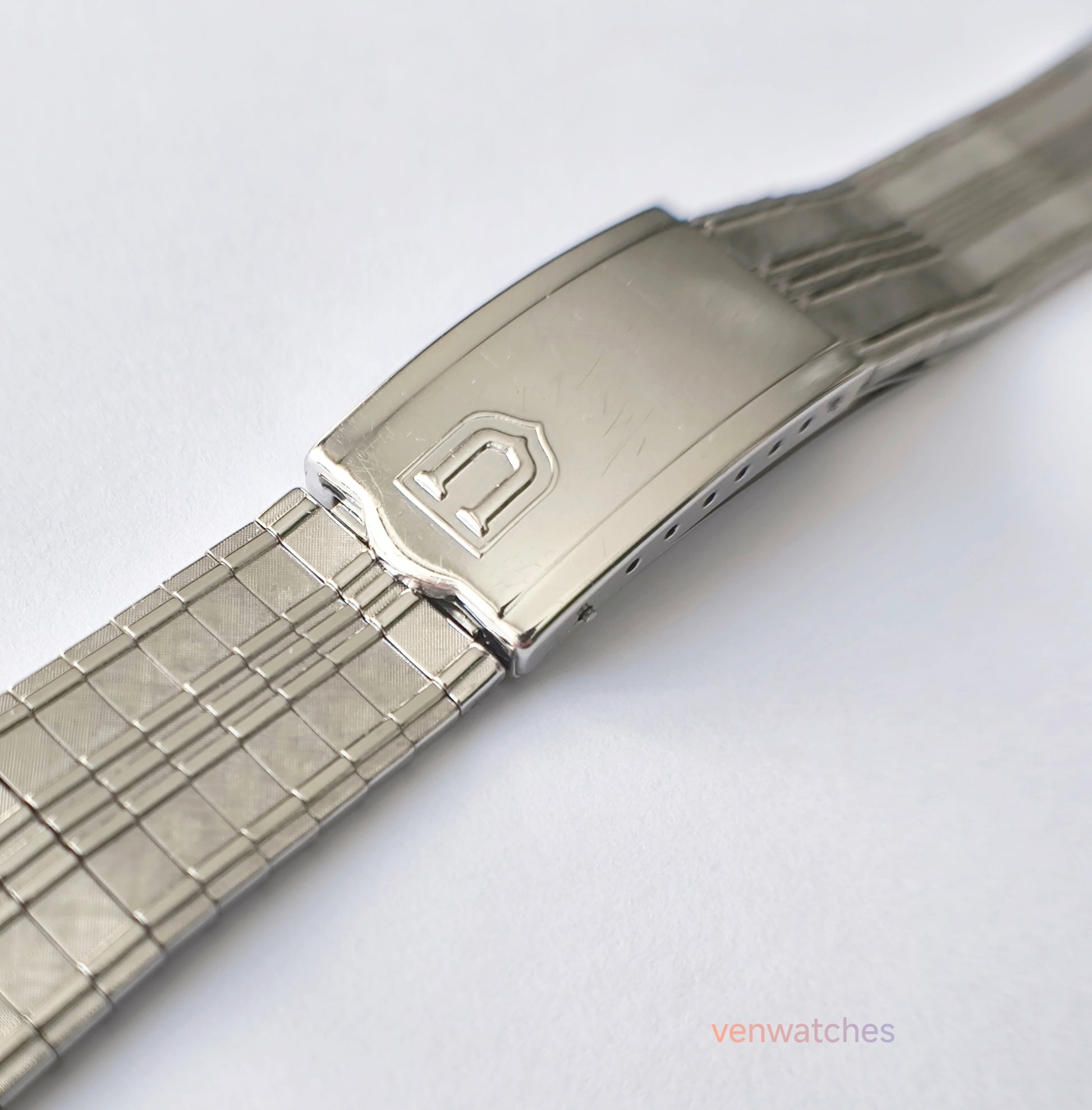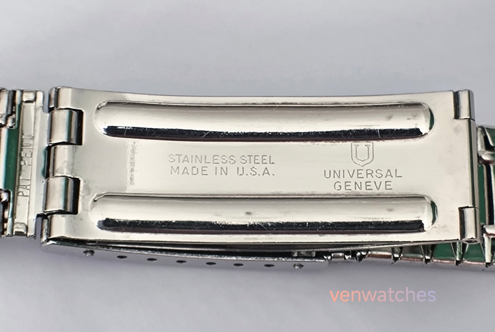 This original stainless steel bracelet represents classic American craftsmanship made specifically for the prestigious Universal Genève Polerouter collection from the 1960s. The Polerouter, designed by the legendary Gérald Genta, was one of the most innovative watches of its era, featuring the revolutionary microrotor automatic movement. This authentic U.S.A.-made bracelet maintains the original design and quality, essential for restoring vintage Universal Genève Polerouter watches to their original elegance.