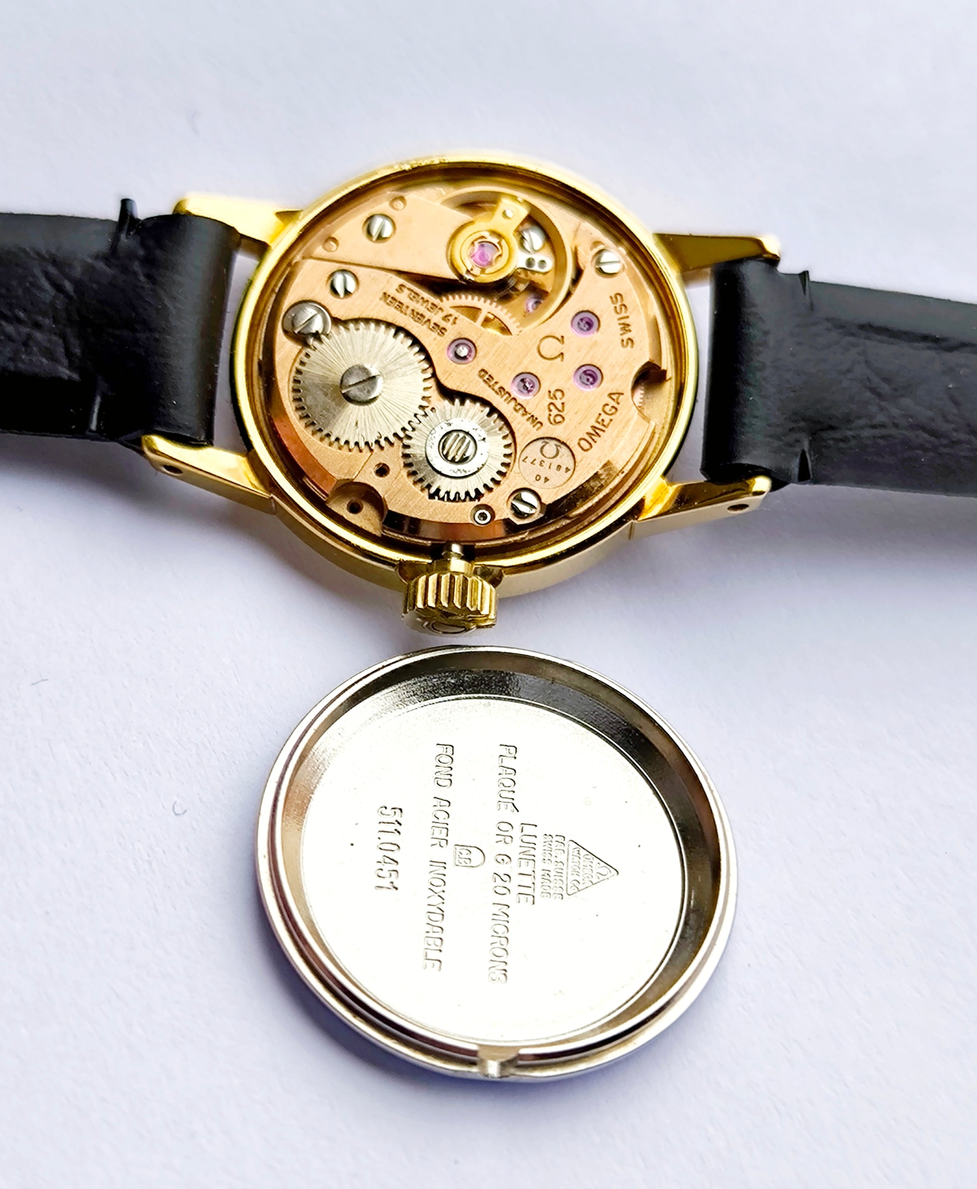 This OMEGA ladies' watch stands out for its remarkable state of preservation. The 20-micron gold plating preserves its warm luster and refined vintage look with minimal wear. Most notably, the watch still retains the original blue factory protective sticker on the caseback — an extremely rare detail that confirms the watch's careful preservation over the decades and adds significant collector value. The watch is powered by the reliable OMEGA Caliber 625 manual-wind movement — running smoothly and keeping very good time. All key components remain fully original: the Omega-signed crown and the crystal with Omega logo in the center. The watch comes with a new generic black leather strap, ready to wear.