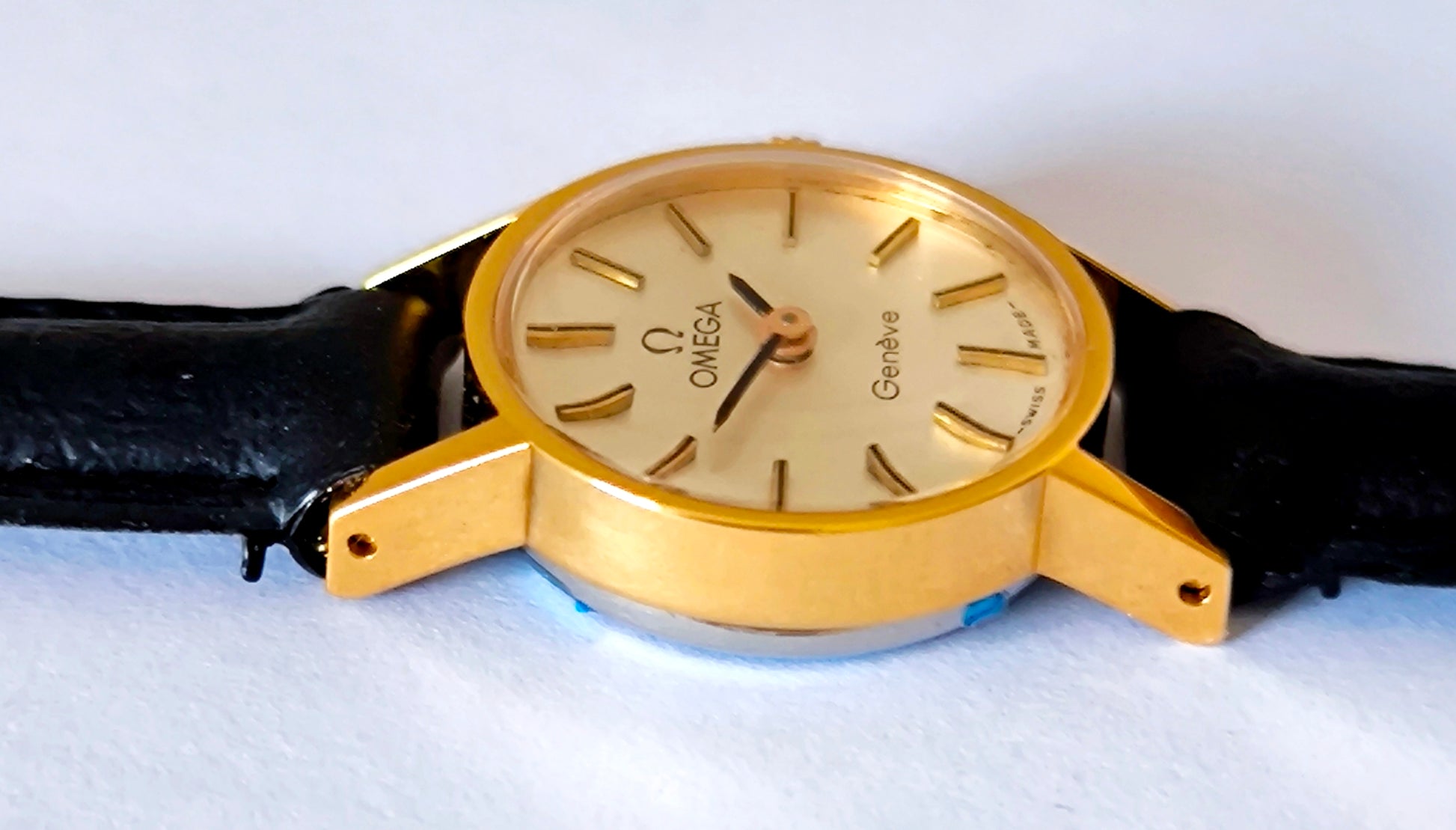 This OMEGA Genève ladies' watch stands out for its remarkable state of preservation. The 20-micron gold plating remains in very good condition with minimal wear, and the sunburst champagne dial retains its original luster. Most notably, the original blue factory sticker on the caseback is still intact — an extremely rare find that confirms the watch's careful preservation over the decades.