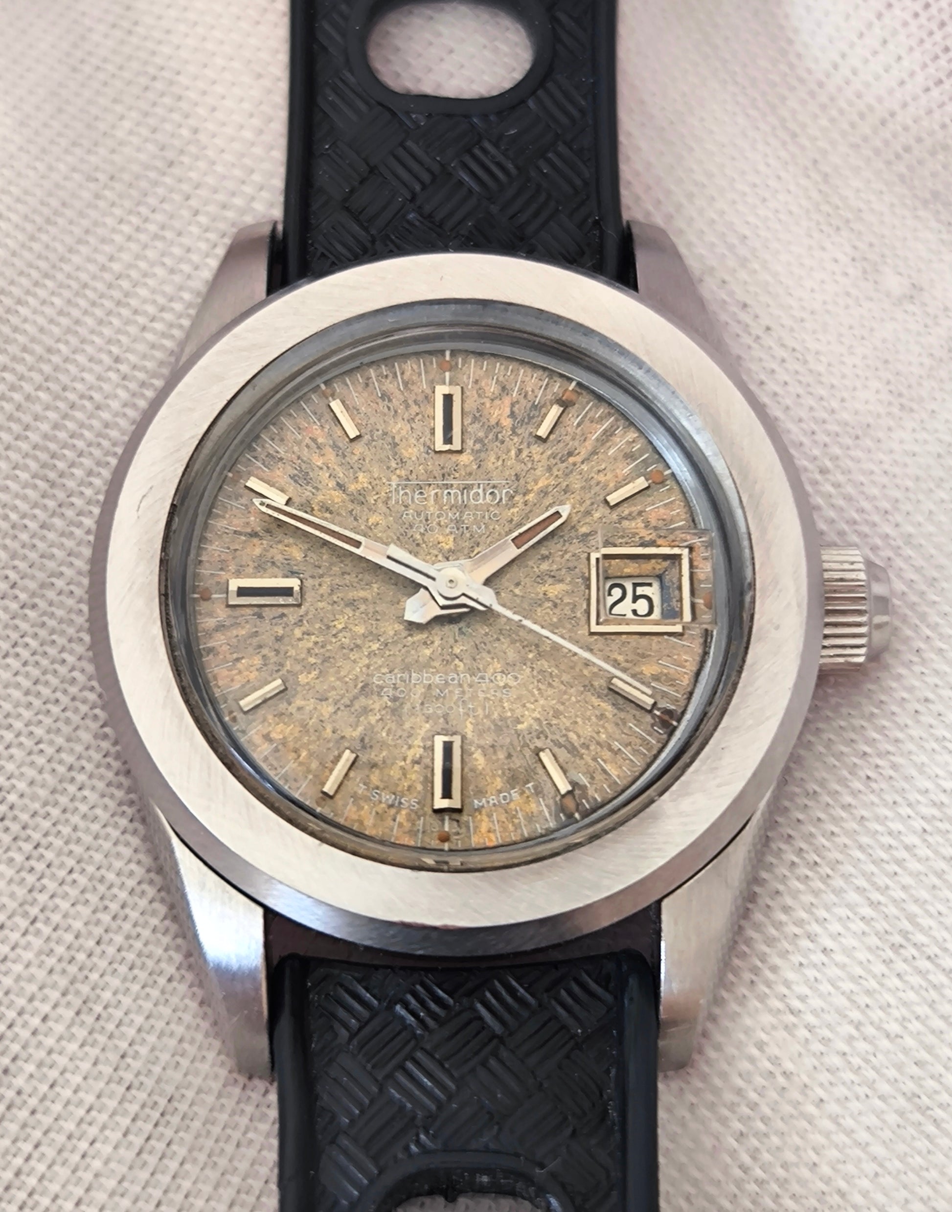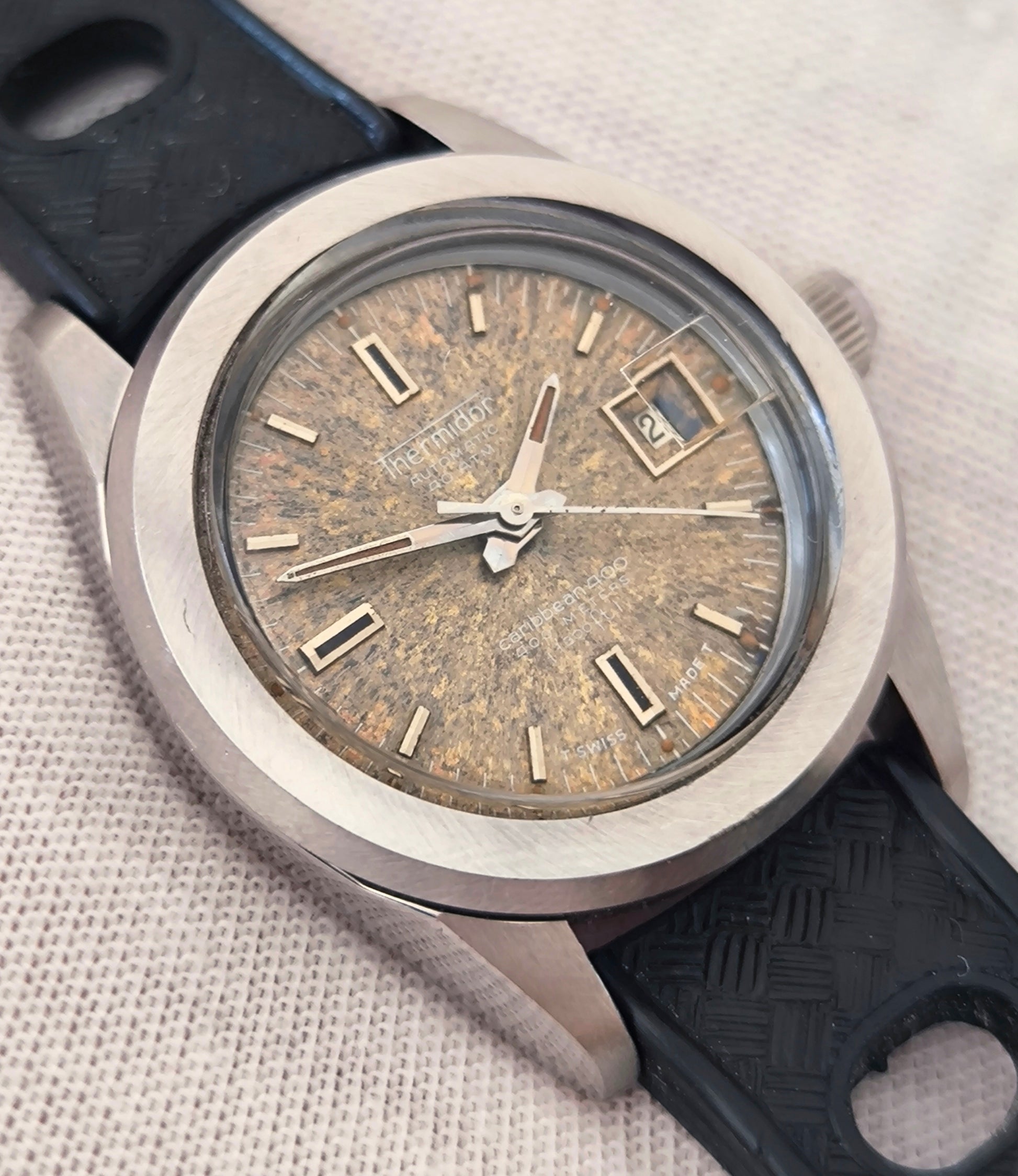 Vintage watches with natural tropical dials have become increasingly collectible and valuable. The Thermidor Caribbean with its unique patina and professional 400-meter diving capability represents authentic vintage character that cannot be replicated, making it a genuine piece of horological history.